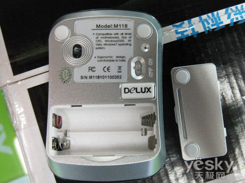 电池仓位于鼠标底面,使用两节7号电池进行供电,微型接受器可以置入鼠身,方便携带和避免丢失,并具有独立的开关。鼠标采用了2.4G无线传输技术,有效使用距离约10米,采用激光引擎,拥有800DPI,一般的日常使用没有问题。