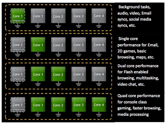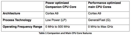 NVIDIA公布的资料显示,LP工艺隐藏核心的频率最高为500MHz,将在系统待机时为后台应用程序像Email同步,社交媒体同步时单独开启使用。当然,如果运行功耗不高的任务,非待机状态如单独播放音乐或低码率视频时也可使用此核心以提高续航时间。