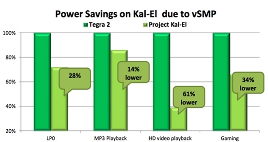 随着运行程序的负载加重,NVIDIA的CPU管理代码将关闭此LP核心,逐个开启GP核心直至开启全部4个达到最大TDP。由此带来的续航能力对比Tegra 2的提升如下: