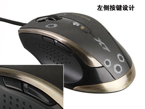 双飞燕 X7针光赢家鼠F3左右键,滚轮,绝招键(默认为3连发,可自定义),和鼠标左侧的两个按键,切换模式键。切换模式键下的呼吸灯在不同模式下还会发不出同颜色,效果非常炫目,同时也让玩家可以从另一方面了解鼠标的是处于第几模式的工作状态。