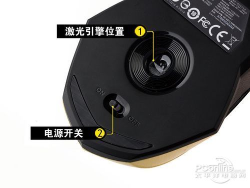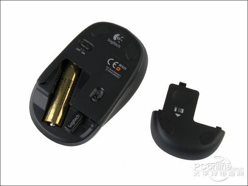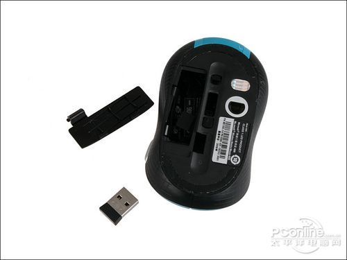 鼠标底部设有光电引擎、电源开关、电池仓和接收器收纳仓,鼠标使用一节AA电池供电,鼠标具有高效的省电设计,让电池具有长达18个月的寿命。值得注意的是,鼠标引擎偏向右边,对于习惯中置引擎的用户而言开始使用可能会有些不方便,但对鼠标性能没有任何影响。