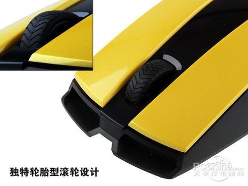 华硕 兰博基尼无线鼠标正面按键设计非常简洁,经典左右键和中键,满足一般的使用需求。鼠标滚轮非常像汽车轮胎,刻纹清晰,触感舒适,能有效防滑。