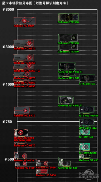通过产品的价位分布图来看,显然AMD的Radeon HD 6000系列产品的价格一般都会略低于NVIDIA一个级别,而实际性能表现则又略胜于对方,劲儿加强显卡的性价比表现。并且,AMD在新一代的 Radeon HD 6000系列产品的等级划分上也非常明显,我们可以直接通过产品型号一目了然的了解到产品的等级划分。反观竞争对手方面,由于GeForce 400系列的起步晚,导致了至今为止NVIDIA仍然未能将全部显卡产品线进行统一。玩家想要购买一款NVIDIA显卡还要区分产品属于第几代DX11显卡,再对比显卡的规格等级。并且新旧两代产品交替出现的价位段,更容易对消费者购买产品是造成混乱。