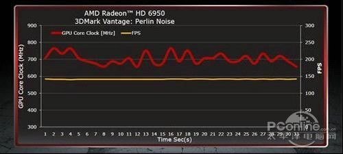简单的来说,就如上图所表现出来的情况一样,红色的线代表显卡的核心频率,黄色的线则代表帧数。PowerTune技术可在传统2D/3D分频的基础上更进一步,在保持游戏帧数的前提下,实现显卡的核心频率的自动调节,更加合理的利用功耗。