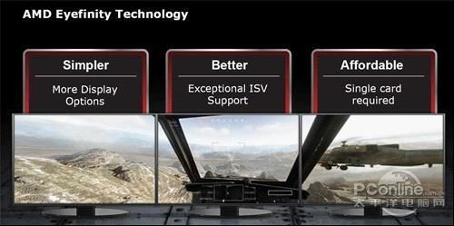 AMD新一代的Eyefinity技术将会在三个方面提供更加优秀的支持,分别包括了:简便、支持和经济。HD6000系列将会让三屏输出甚至单卡6屏输 出实现更加简便;同时Eyefinity技术也将获得更好的ISV(独立软件开发商)支持,包括游戏、软件等;并且新一代的多屏输出也将会让玩家获得更加 经济实惠的方案。接下来,我们就详细为大家介绍一下Eyefinity在这些方面的更新。