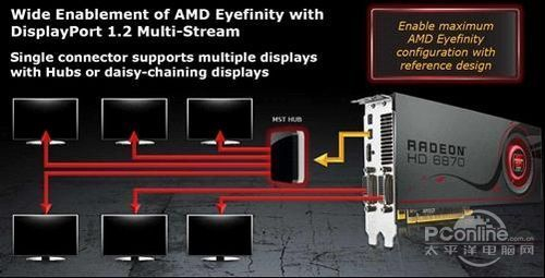 AMD官方为我们提供的两种连接示意图上来看,想要组建单卡六屏输出必须借助DP1.2规范当中的单接口多流输出技术,能够从单一一个mini-DP上实 现三卡甚至四卡的多显示输出,而两个mini-DP或者一个mini-DP+双DVI或者任意一种您能够想得到的组合方式,均能够实现六屏输出的组合。