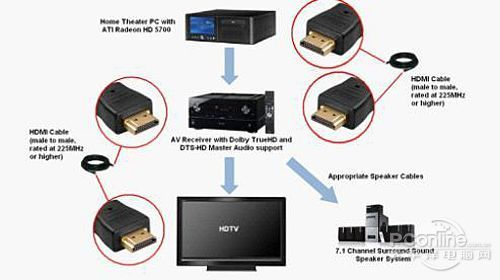 下面我们就来看看如何用HD5700来组建HD音频系统的具体方案。在以前我们想要实现带有杜比HD或DTS Master音频信号的HDMI影音输出需要通过一下几个步: