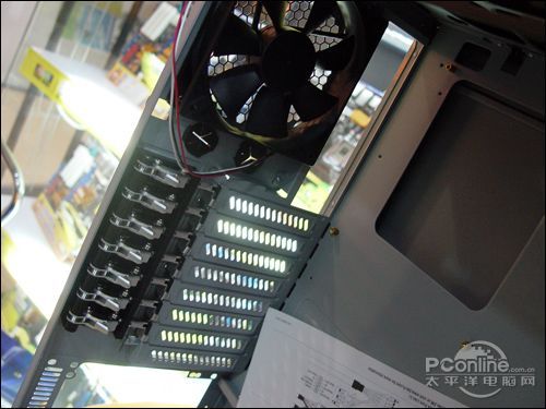 游戏悍将 霸道 至尊版前置面板配备双LED风扇,打开后是6组热插拔接口,支持4组HDD热插拔和2组SSD热插拔。机箱内置4个5.25英寸光驱位,可支持四路显卡,配备有2×USB 2.0接口、1×USB 3.0接口、1×耳机接口、1×麦克风接口。