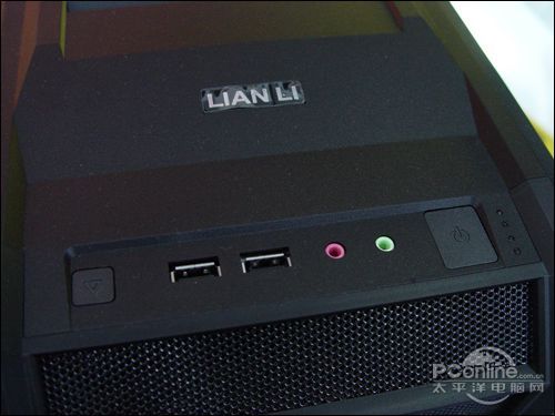 机箱顶部设计了两个USB和音频输出接口,同时还有联立醒目的LOGO,整体机壳在组合拆装时事十分容易的,安装光驱或是清理上盖风扇灰尘都十分容易。