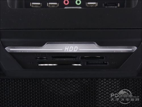 除了提供常规的前置接口外,星宇泉 雄霸9801机箱还兼顾了时下数码产品都会使用到不同的存储卡,特别在机箱前面板上方预装可一套多合一读卡器,方便用户直接通过机箱自带的读卡器读取存储卡上的数据资料。