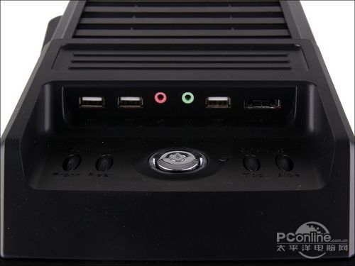 星宇泉 雄霸9801机箱前置接口以及功能按键设计在机箱顶部的小平台内。前置式接口并未采用隐藏式设计,在使用一段时间后会,接口容易氧化和形成灰尘堆积的情况。机箱前置接口包括了3个USB2.0接口,1个E-SATA接口以及一组音频输入输出接口。机箱功能按键的设计也非常丰富,除了常规的机箱启动及重启按键外,还提供了机箱内部风扇的开关控制按键,可以控制机箱内部前部,顶部,背部以及侧面四部机箱风扇的开启及关闭操作。