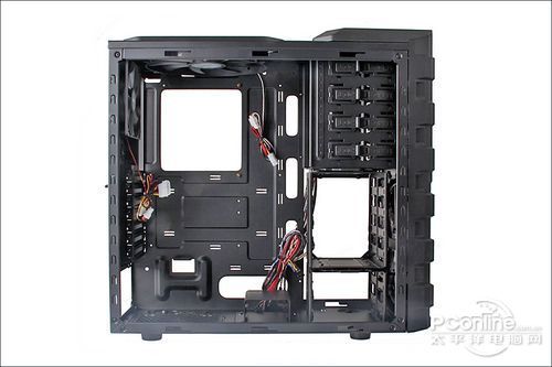 星宇泉 雄霸9801机箱采用标准的ATX塔式结构设计,机箱内部经过黑化处理,使内部板材更为耐用、耐腐蚀。同时机箱支持背板走线功能,让机箱内部空间更整洁。另外,我们可以看到雄霸9801和一般的中低端电源下置机箱不同,在电源安装位上方增加了一块隔板,使机箱内部分开了上下两层,形成各自独立的风道,对整体散热有很大的帮助。