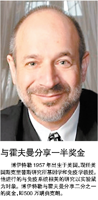 当地时间11时30分(北京时间17时30分),评审委员会在瑞典首都斯德哥尔摩卡罗琳医学院宣布,博伊特勒和霍夫曼获二分之一奖金,而斯坦曼获另外二分之一奖金。