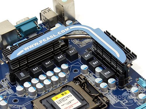 超频常常会导致CPU功耗增加,同时也会导致MOS温度升高。为了保证稳定运行,超频主板常常专门为供电MOS设计散热片。而在高端主板上则会采用散热效果更出色的热管加多鳍片散热系统。翔升金刚P67T-PRO就采用了镀镍热管加多鳍片散热片组成的散热系统为MOS部分散热。