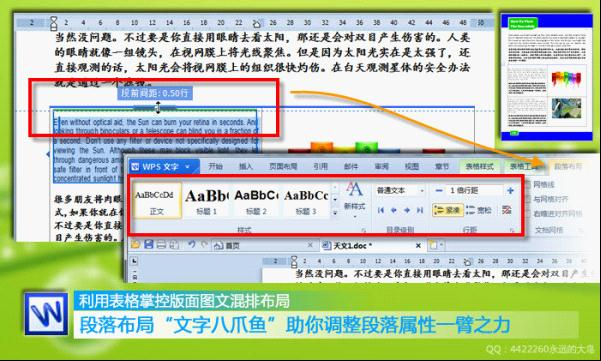 文档中图文的混排想要做到美观整齐,使用表格是一个很好的实现方式。利用表格的单元格可调的特性调整版面、控制边界、添加各种分隔线、设置线型及颜色等, 只要将不需要的框线去掉设置为无色即可。而不论是普通段落还是单元格中的段落,都是可以方便地使用WPS Office 2012中称之为“文字八爪鱼”的段落布局工具,这个名字叫得实在是太形象了,有了它,段前段后距、缩进等操作就十分方便、直观。