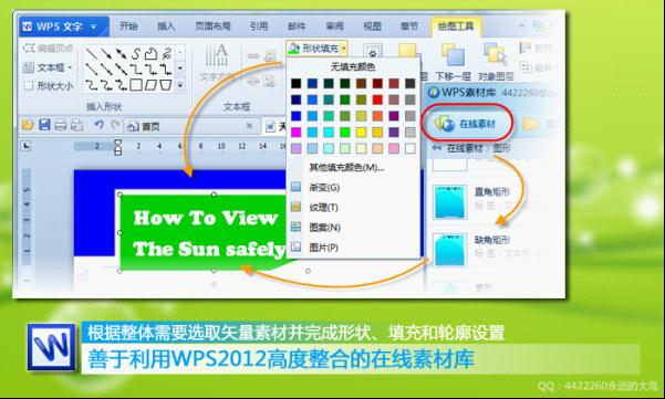 当然,你也可以使用传统的形状来添加这样的效果。不论何种方式,WPS Office 2012中对于图形类对象的操作最主要的功能都集中在了“绘图工具”选项卡下的“图片样式”功能区中。无外乎包括图片内部色彩的填充,轮廓线形和色彩的设 置,只要你做到心中有数,做出一张高质量的图形是十分容易的。