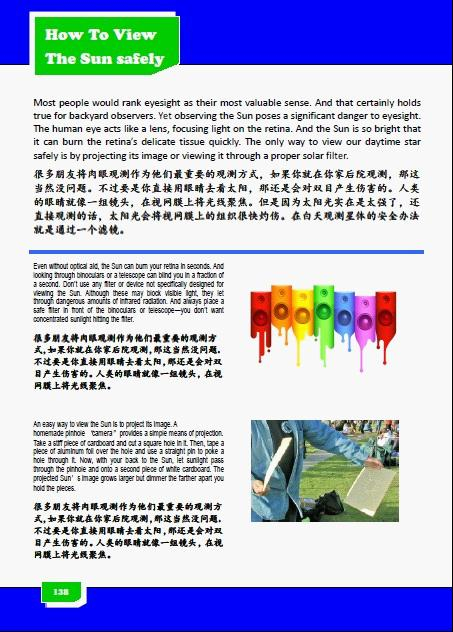 先来看看成品的页面,这是中英文混排的一个关于观测太阳的页面,页眉和页脚处是深蓝色的色彩条,题目和页数使用了风格类似的形状块,页面正中有一条横线分割。页面下方和上方采用了不同的分栏。当然,这只是一些描述,至于为什么这样设计,在随后的讲解过程中都会提到。