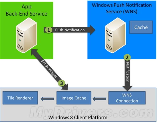 微软表示,在这种模式下,应用程序的后台服务器会向WNS推送内容,图片则是直接从后台服务器抓取过来的,然后两者共同在Windows 8设备上显示出来。