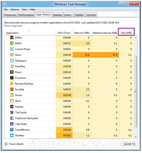Windows 8新的任务管理器也支持查看应用程序的活动贴片占用的资源: