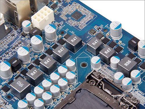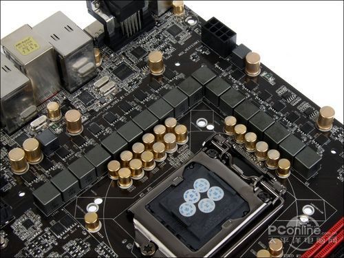 主板的供电用料一点也不马虎,采用的全部都是特别定制的尼吉康亮金固态电容,搭配1R0铁素电感,以及1上1下的低抗阻MOSFET管,强劲的用料保证了处理器即使在重度超频下也能获得稳定、纯净的供电。