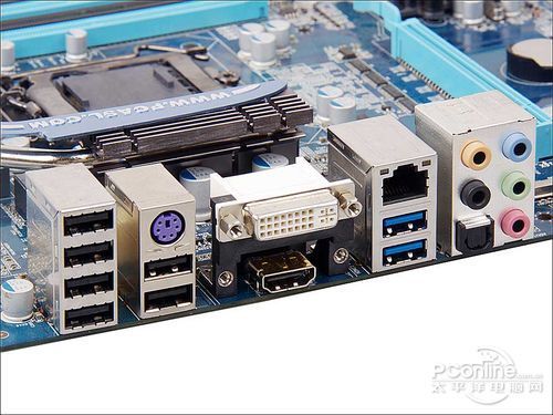 主板I/O接口还算够用,包括4个USB2.0、1个PS/2键鼠接口、VGA+DVI+HDMI全视频接口、RJ-45网线接口和8声道音频。