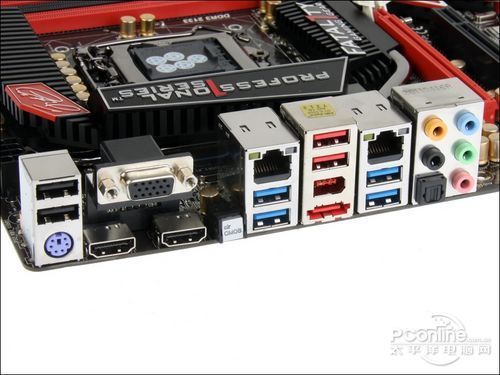 主板提供非常丰富的I/O接口,包括4个USB2.0接口、1个PS/2键鼠接口、1个VGA接口、2个HDMI接口、2个RJ-45网卡接口、4个USB3.0接口、1394接口、E-SATA3.0接口、8声道音频和光纤音频接口,此外还有一个带灯光的Clear CMOS按键。