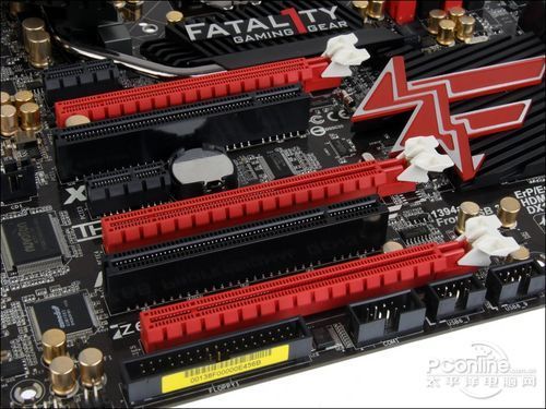 主板一共提供7条扩展插槽,包括2条PCI-E X1插槽、2条PCI插槽和3条PCI-E X16插槽,支持X8+X8双卡SLI/交火或者X8+X8+X4三卡SLI/交火,3条显卡插槽中上面两条显卡插槽是CPU直接提供的,能够支持高速的PCI-E 3.0规范,最下面一条市是主板南桥提供的,最高支持PCI-E 2.0 X4速度。