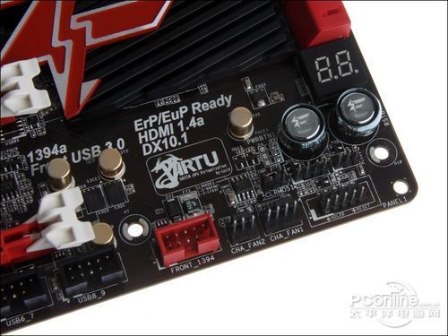 主板提供6个红色的SATA3.0接口和4个黑色的SATA2.0接口,其中靠近SATA2.0接口的2个红色SATA3.0接口是Z68原生的,其余4个则是第三方芯片提供的。这里所有SATA接口都采用了翻折式设计,因此不会有被大型显卡挡住的烦恼。