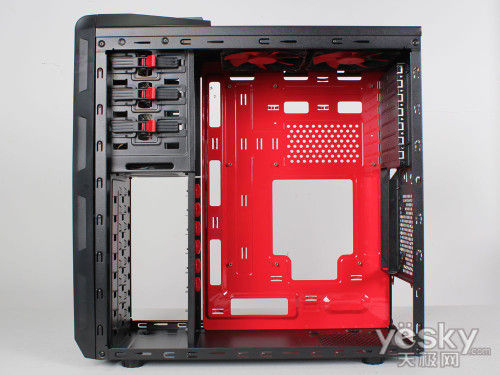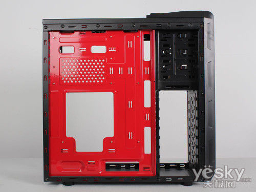 鑫谷 走线王C2机箱机箱内部构造采用较为传统的设计,尺寸为490×190×424mm。而内部板材则保持了一贯的优质SCEE镀锌钢板,同时采用了箱体黑化+机架红化的设计,保证了防辐射性能而且防锈蚀同时美观大方。可以看到,鑫谷 走线王C2机箱的主板托板是镂空的设计,把主板的散热空间发挥到最大,整体来说十分美观实用。