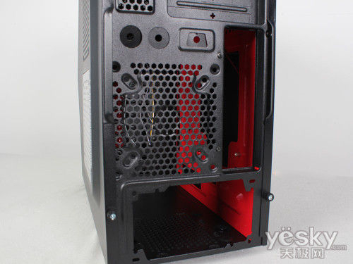 鑫谷 走线王C2背部设计也很重视散热效果,提供了一个支持8/9/12cm三种规格安装的散热风扇位外,还在PCI槽位的上设置了一排散热冲孔设计。