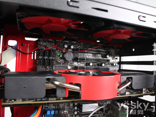 导流板上还能够安装一个8cm的小风扇,而且还有孔位提供安装水冷管。