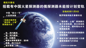 搭载有中国首颗火星探测器“萤火一号”的“福布斯-土壤”探测器于北京时间9日4时16分在拜科努尔发射场搭乘俄运载火箭发射升空。688秒后,“福布斯-土壤”探测器与俄“天顶-2SB”运载火箭的第二级脱离。按计划,安装在“福布斯-土壤”探测器上的主发动机将在此后启动,并通过多次点火将两个探测器送入飞往火星的轨道。然而,“福布斯-土壤”在随后飞行过程中出现意外,未能按计划实现变轨。