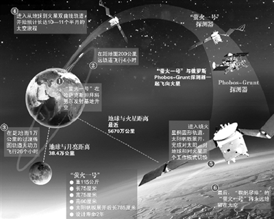 按计划,“萤火一号”随俄罗斯火箭升空后,将由“福布斯-土壤”带领,在距地面200公里的圆形轨道飞行4小时,后变轨至距离地面1万公里的过渡轨道,绕大椭圆一圈,经26小时的无动力飞行后,主发动机点火,两个探测器将彻底告别地球,进入地火轨道。