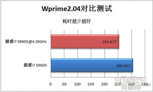 由于Wprime并不支持六核心,测试仅使用到四个核心。酷睿i7 3960X在Wprime测试中,耗时为306.057秒。