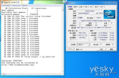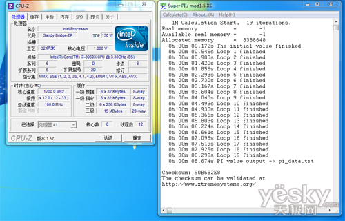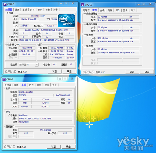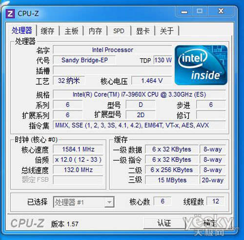 通过CPU-Z身份认证,本次测试的酷睿i3 3960X采用了1.5MB 8通道二级缓存,15MB三级缓存。酷睿i7 3960X支持SSE4指令集,VT-x、AES、AVX技术。核心数为六核心十二线程,倍频设计为12X至33X倍频。