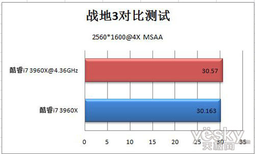 从这三款游戏帧数对比来看,超频前后的差距并不明显。甚至有些游戏的帧数差距仅1帧,可以说在游戏进行过程中没有变 化。从测试中可以看出,现在主流3D游戏对显卡的要求高于CPU。同时也从侧面证明了酷睿i7 3960X已经性能溢出,虽然没有对显卡造成瓶颈,但是性能优势完全没有发挥出来。