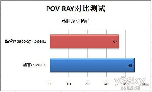 POV-RAY渲染测试中,我们渲染一个1600*1200的图片,测试CPU 3D渲染时间。酷睿i7 3960X在POV-RAY测试中,耗时为45秒。