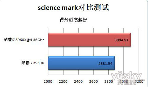 由于Scienes Mark采用科学计算进行测试,对CPU浮点性能依靠性更高。超频后的酷睿i7 3960X浮点性能并没有大幅增长。