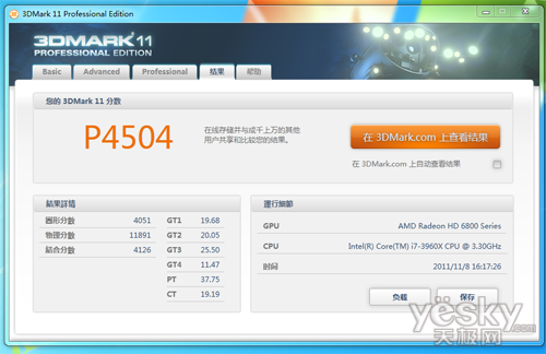 酷睿i7 3960X在3Dmark11测试中,得分为4504分。其中图形分数为4051,物理分数为11891,结合分数为4126。