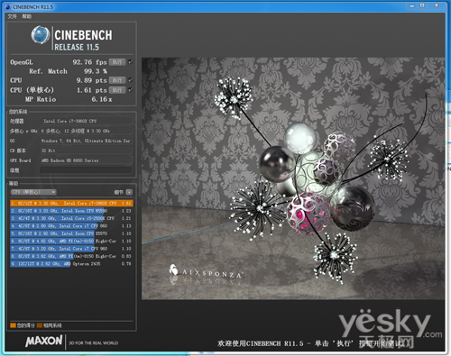 CineBench R11.5测试CPU的单核以及多核性能,并且测试显卡的Opne GL处理性能。其中,单核心测试使用单核心和线程渲染一张高精度的3D场景画面,多核心测试先使用一个线程,第二次使用全部处理器核心和线程。