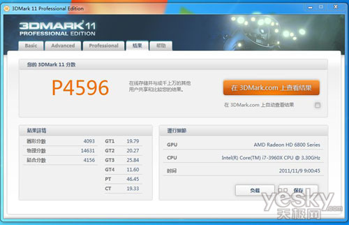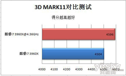 超频后的酷睿i7 3960X在3Dmark11测试中得分为4596,与默认频率相比,增长了92分。