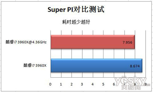 Super PI受主频影响十分明显,超频后的酷睿i7 3960X在测试中创造了最短时间的记录。在Super PI测试中,酷睿i7 3960X占尽先机。