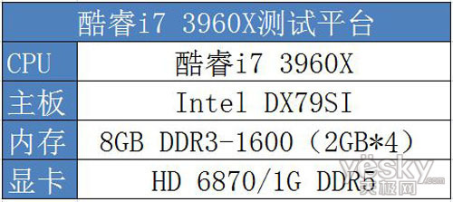 本次测试平台CPU为酷睿i7 3960X,Intel原装DX79SI主板,采用X79芯片组。8GB DDR3-1600四通道内存(2GB*4),显卡为HD 6870显卡。