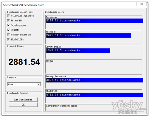 酷睿i7 6930X平台在Science Mark测试中得分为2881.54,其中内存测试得分为3827.59。