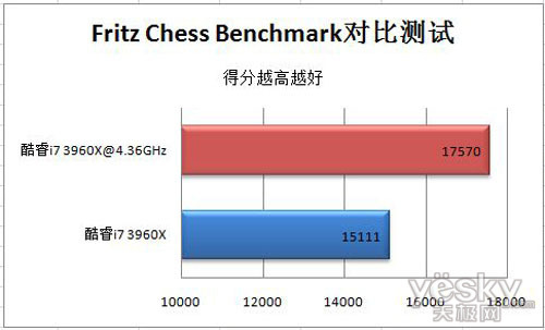 Fritz Chess Benchmark对系统主频的提升更加敏感,酷睿i7 3960在超频前后的差距同样很大。