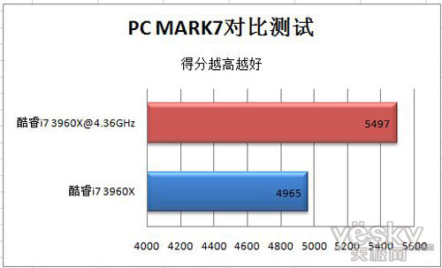 超频后的酷睿i7 3960X得分为5497,较超频前增长了近500分。可以说,酷睿i7 3960X超频后Pcmark7得分增长了10%。