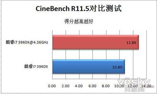 CineBench R11.5主要受到多核心与主频的影响,酷睿i7 3960X在超频前后的区别十分明显,得分提升了25%的较大幅度。