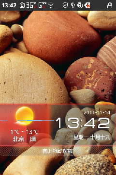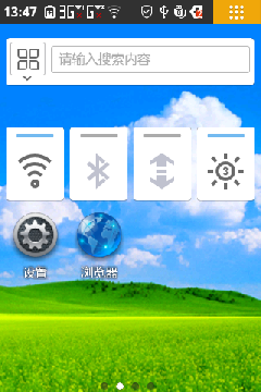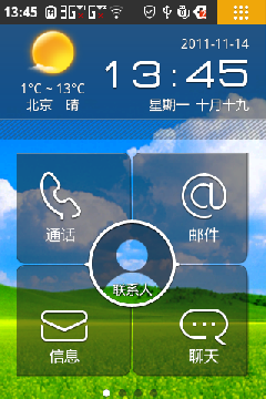 乐Phone mini 的系统是联想深度定制的乐OS 3.0,基于Android2.3研发。在UI界面上做了全面的修改,锁屏界面采用了向上滑动解锁的方式,进入主页面后,映入眼帘的是经典的四叶草界面,每一片叶子都是一个快捷应用。
