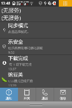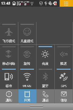 下拉屏幕顶部的状态栏,可以看到当前通知列表,在这里联想做了深度的定制,通知列表的低端分别增加了通知、开关、通话、信息四个快捷按钮,方便用户快捷操作。在点击”开关“按钮后,通知栏切换为跟踪系统属性的小按钮。