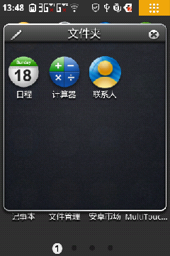 点击屏幕的右上角黄色图标,便可以进入应用程序菜单列表,图标还是延续了乐OS的圆形图标,长按应用图标,可以对其进行移动和卸载;不仅如此,还加入了文件夹的功能,文件夹也采用了乐OS的圆形设计风格。